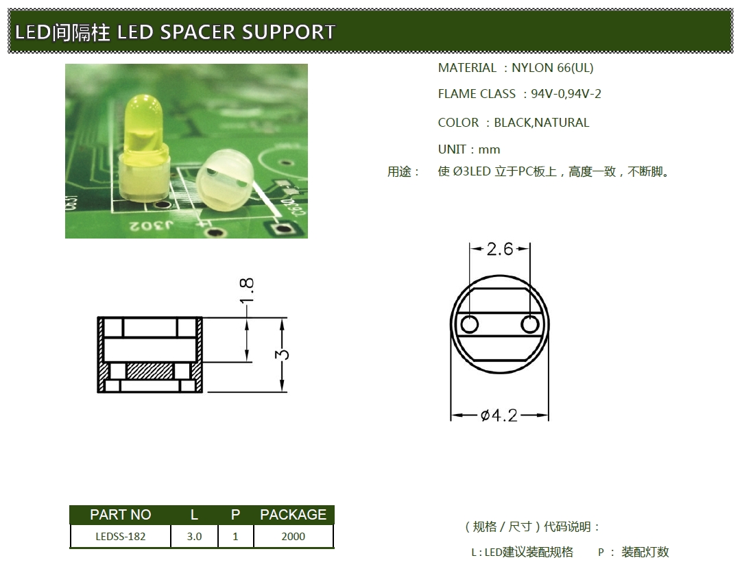 LED間隔柱LEDSS-182,使直徑?3的LED燈柱固定在PCB板上,使LED燈柱高度一致,不斷腳。