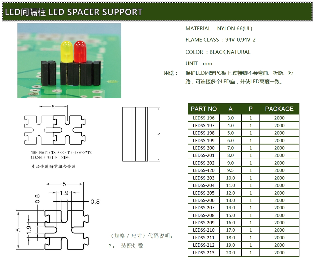 LED間隔柱LEDSS-208,保護LED燈柱固定在PCB板上,使LED燈柱接腳不會彎曲、折斷、短路,可連接多個LED燈座,并使LED高度一致。