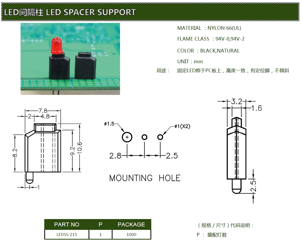 LED間隔柱LEDSS-215,保護LED燈柱固定在PCB板上,使LED燈柱接腳不會彎曲、折斷、短路,并使LED燈柱高度一致。