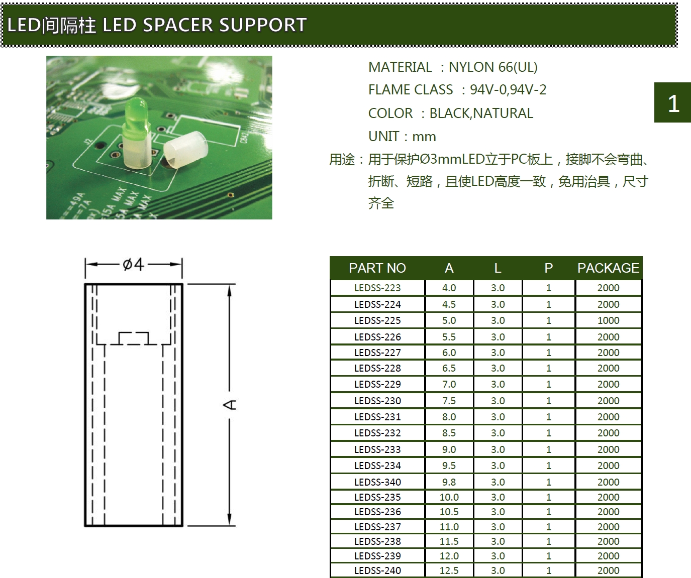 LED間隔柱LEDSS-225,保護?3mm的LED燈柱固定在PCB板上,使LED燈柱高度一致,接腳不會彎曲、折斷、短路,且免用工具,尺寸齊全。
