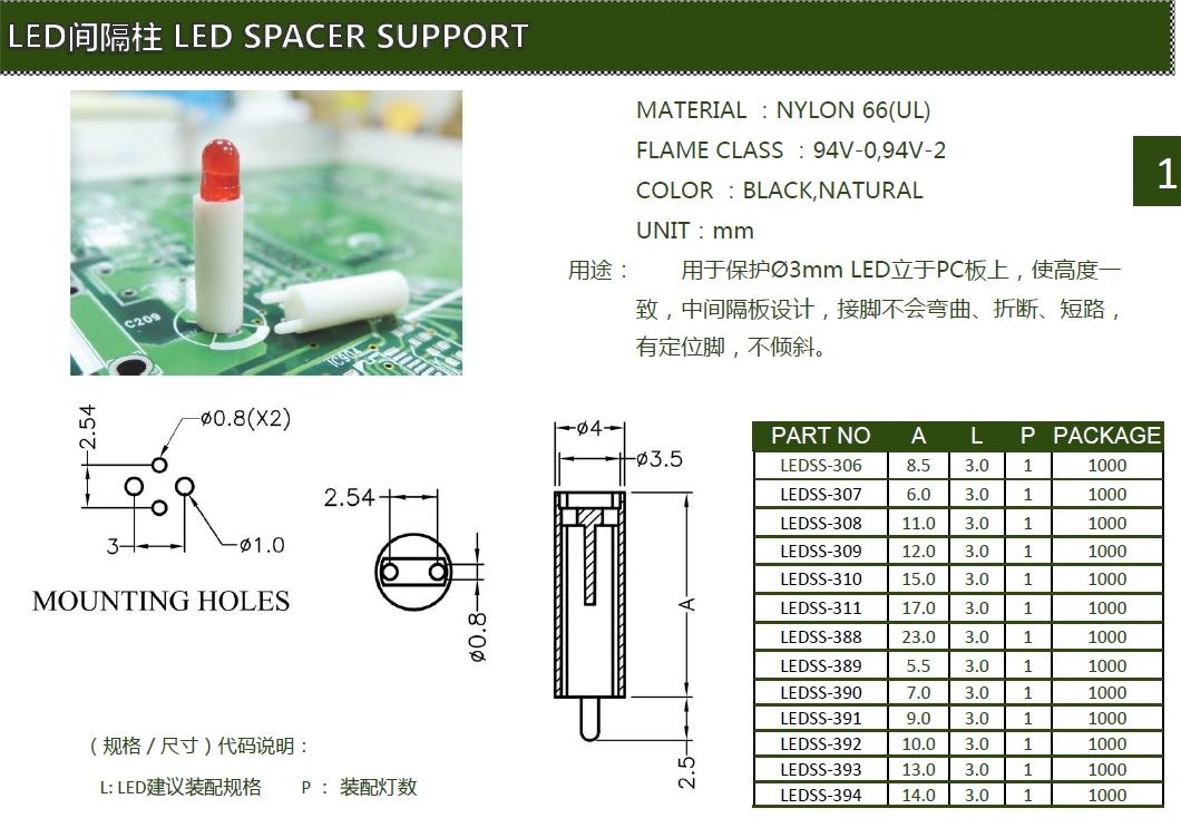 LED間隔柱LEDSS-389,保護?3mmLED燈柱立于PCB板上,LED燈柱使高度一致,LED間隔柱中間隔板設計,LED燈柱接腳不會彎曲、折斷、短路,LED間隔柱有定位腳,LED燈柱接腳不歪斜。