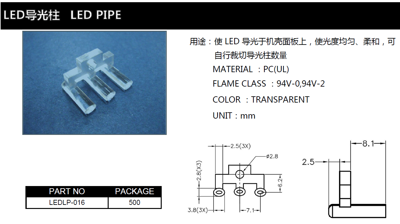 我們主要有產(chǎn)品有LED導光柱,也稱PC導光柱,導光柱,LED導光罩,LED導光帽,Light Pipe,導光蓋我們是PC導光柱生產(chǎn)廠家,LED導光柱批發(fā),透光柱,導光條,導光棒等。