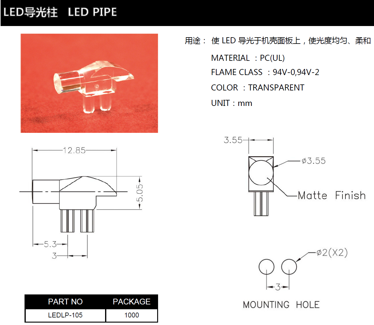 LED導(dǎo)光柱LEDLP-105,將LED燈柱導(dǎo)光到機(jī)箱面板上,使LED燈柱亮度均勻、柔和。