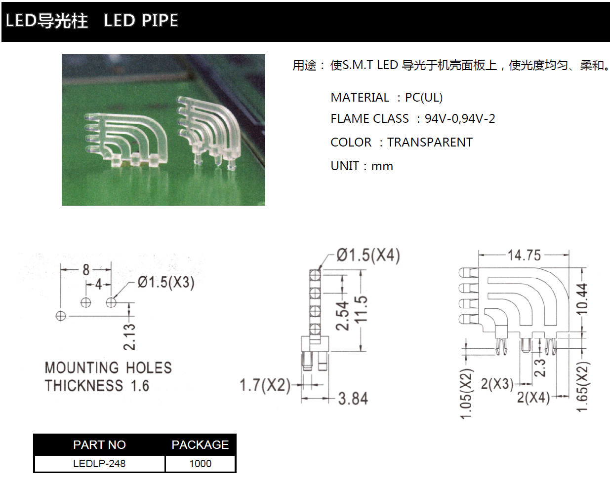 LED導光柱LEDLP-248,將LED燈柱導光到機箱面板上,使LED燈柱亮度均勻、柔和。