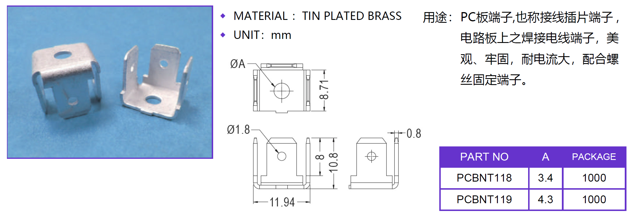 PC板端子,也稱接線插片端子 ,電路板上之焊接電線端子,美觀、牢固,耐電流大,配合螺絲固定端子。