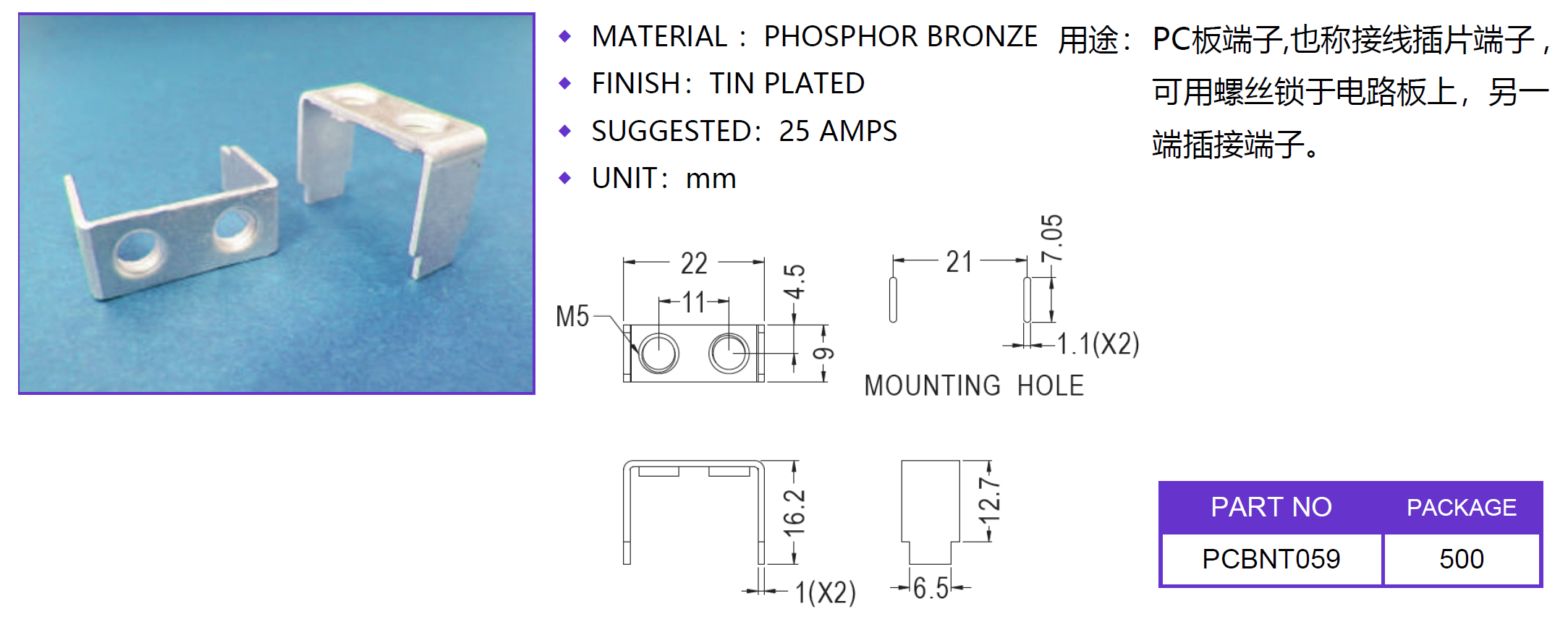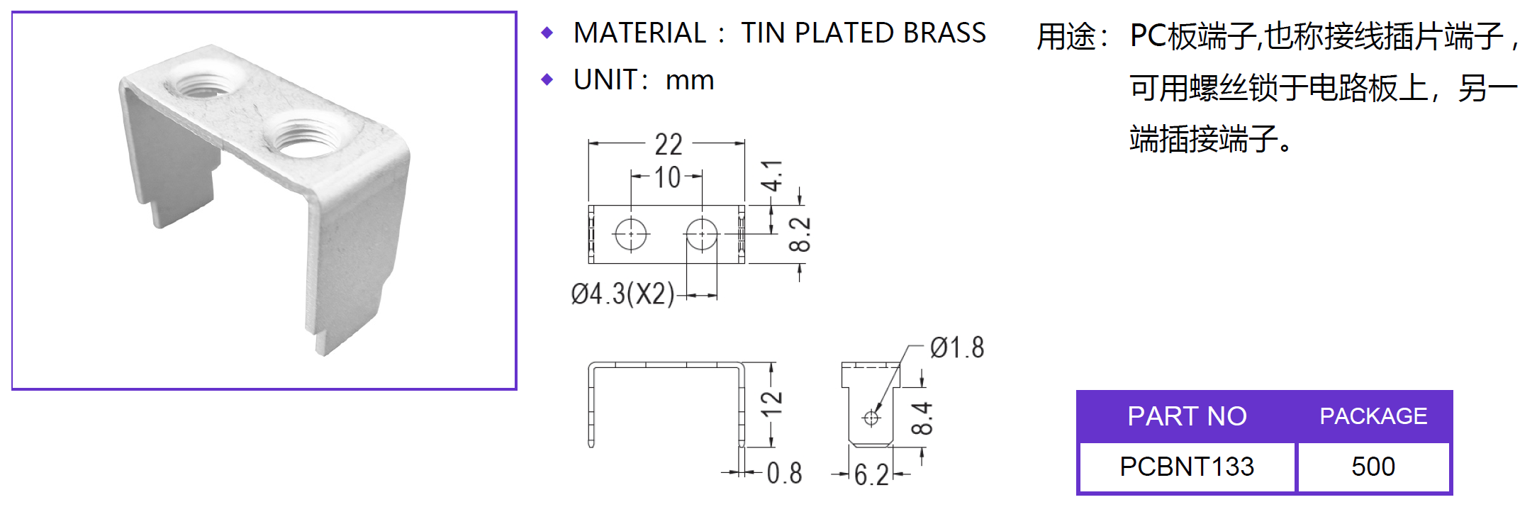 PC板端子,也稱接線插片端子 ,可用螺絲鎖于電路板上,另一端插接端子。