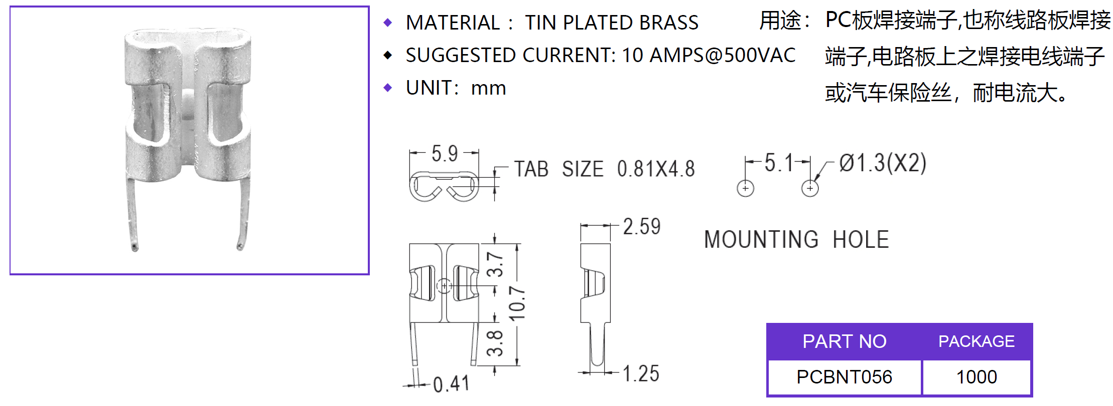 電路板上之焊接電線端子或汽車保險絲,耐電流大。