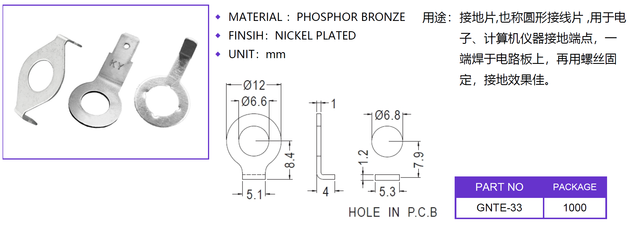 接地片,也稱圓形接線片,用于電子、計算機儀器接地端點,一端焊于電路板上,再用螺絲固定,接地效果佳。