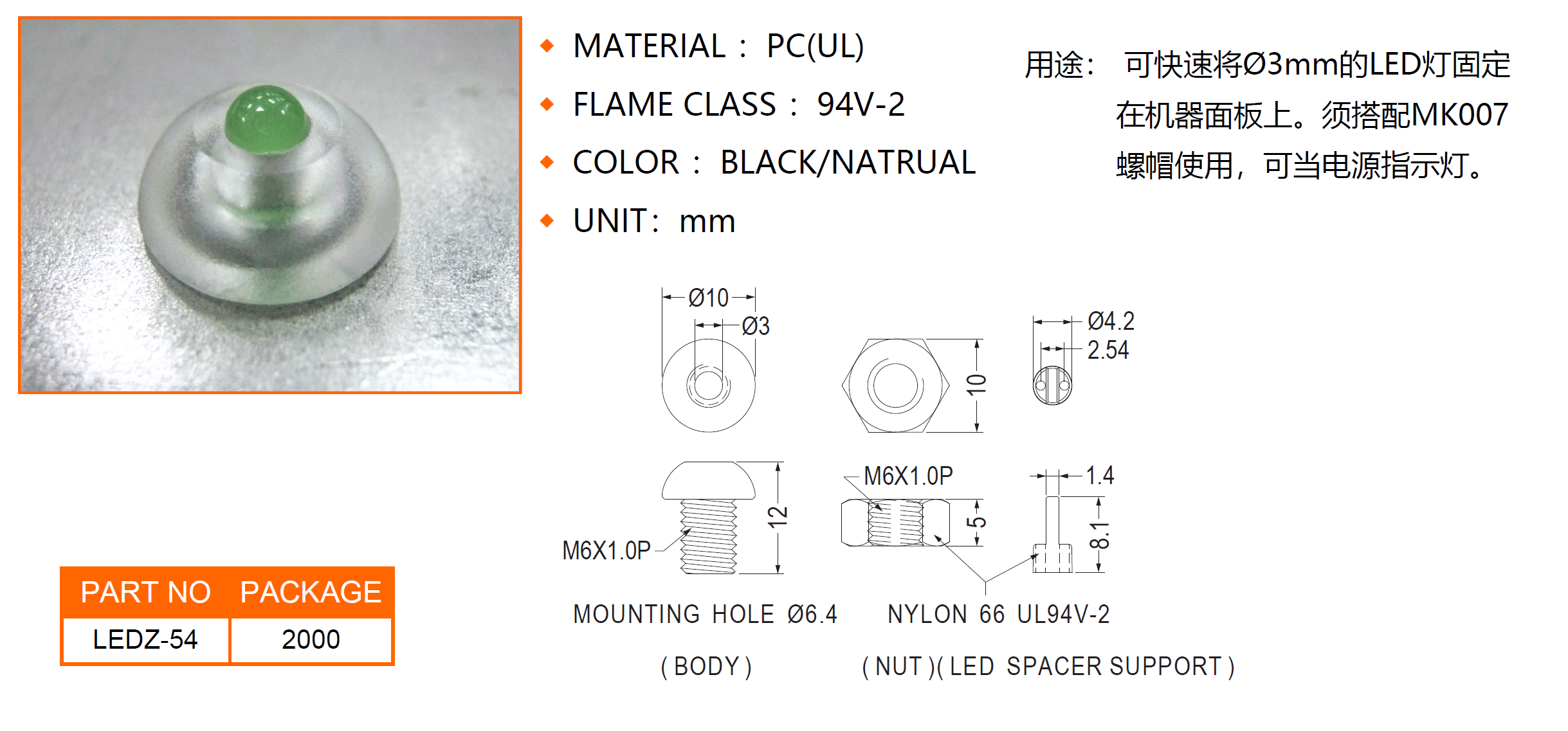 快速固定?3 LED于面板上,須搭配MK007螺帽使用,可當(dāng)電源指示燈。
