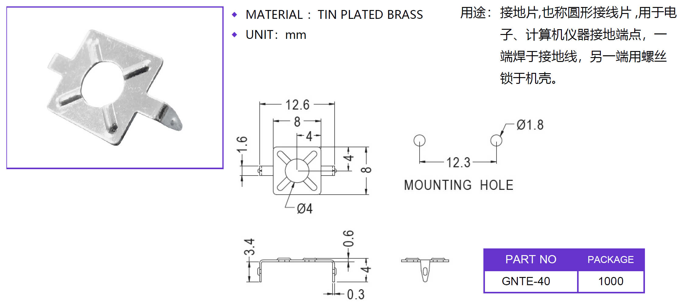 用于電子、計(jì)算機(jī)儀器接地端點(diǎn),一端焊于接地線,另一端用螺絲鎖于機(jī)殼。